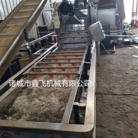 工作原理:清洗機采用汽泡水浴清洗是利用漩渦氣泵產生的高壓氣流,通過浸入在水槽中的曝氣管產生的氣泡群對物料進行沖擊、搓洗,防人工搓洗,將粘附物料上的泥土、泥沙、植物桔梗、枝葉等雜物剝離,清洗能力大、洗凈率高且不損傷物料,經過旋翻催流至輸送網帶,在網帶上進行翻浪清洗zui后傳送至輸送帶。本設備除電機、等標準件外均采用不銹鋼SUS304材料制作,完全符合出口食品衛生要求。比重大體積小的異物在自身的重力作用下會沉到槽底,由排污口排出,比重小的漂浮物在水流和波動的推動下進入漂浮物撈取裝置,物料體積大的進入下道工序。