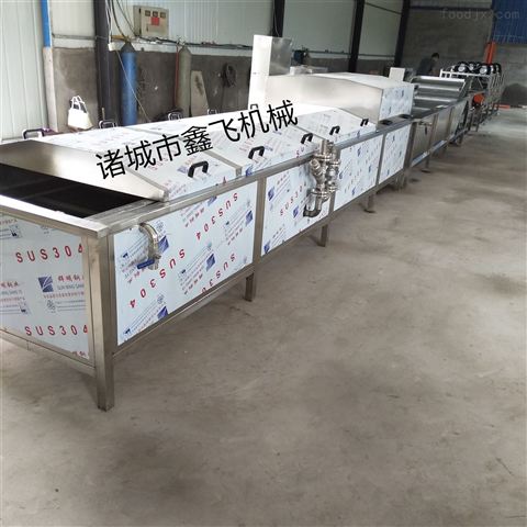 毛輥清洗去皮機(選配) → 提升輸送機→ 毛刷去雜機→氣泡清洗機→雙層輸送機→球根莖類切菜機→葉菜類切菜機→提升輸送機→氣泡漂洗機→氣泡脫鹽機→噴淋氣泡脫鹽機→振動瀝水機→脫水機(選配)→壓榨機(選配)→提升輸送機→連續拌料機→真空包裝機 →巴氏殺菌機→冷卻機→振動瀝水機→翻轉風干機