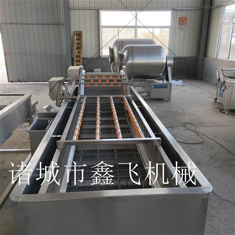 主要應(yīng)用于肉類,禽類,海鮮、水果、蛋品、水果的解凍。將凍肉(板、塊)等料放進(jìn)加滿水的解凍池,用高壓氣泡將水快速翻騰,讓產(chǎn)品在解凍池內(nèi)相互碰撞,相互摩擦,從而達(dá)到快速解凍的目的。解凍機(jī)解凍池旁邊有恒溫池,水從恒溫池流入解凍機(jī)入料口處,隨著凍品的化冰解凍,網(wǎng)鏈上的產(chǎn)品向出料方向出料,解凍池內(nèi)的水溫慢慢下降,到出料這段時(shí)間,水再從解凍池進(jìn)入到恒溫池,這樣循環(huán)利用,起到對水資源的節(jié)約,又能環(huán)保。既能降低成本,又能提高工作效率。